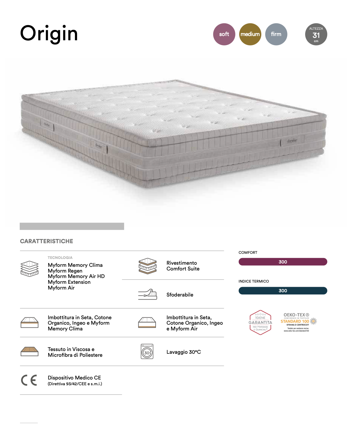 Origin è la scelta di chi apprezza l’eleganza senza tempo e la qualità autentica. Il raffinato Comfort Suite accoglie con un’armonia che si percepisce al primo contatto. Il rivestimento in viscosa e microfibre ultra soft e le imbottiture in Seta, Cotone e Ingeo donano una piacevole freschezza naturale. Nel cuore, le stratificazioni evolute in Myform ad altissima densità offrono un comfort equilibrato e su misura, in grado di seguire con naturalezza il profilo del corpo. Origin è un invito a riscoprire ogni notte il valore esclusivo del comfort sartoriale.